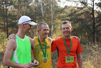 Zwycięzcy minimaratonu i ich dekoracja. Hmm, nie wiem czy ten starszy Pan po lewej na podium faktycznie biegł. :-)